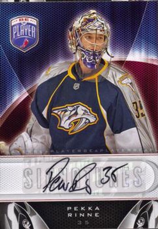 The Pekka Rinne 2009 Upper Deck Be A Player #S-RI Signatures card is 1 of 5 Pekka Rinne's card variations in the 2009 Upper Deck Be A Player set being tracked by Sports Card Investor, including Base /99, Player's Club /15, Goalies Unmasked /499, and Autographs /10.