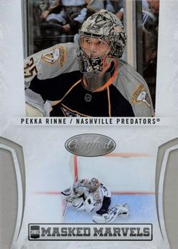 The Pekka Rinne 2010 Certified #13 Masked Marvels /500 card is 1 of 42 Pekka Rinne's card variations in the 2010 Certified set being tracked by Sports Card Investor, including Base /799, Platinum Red /999, Platinum Blue /250, Mirror Red Materials Dual /150, and Mirror Blue Materials /100.