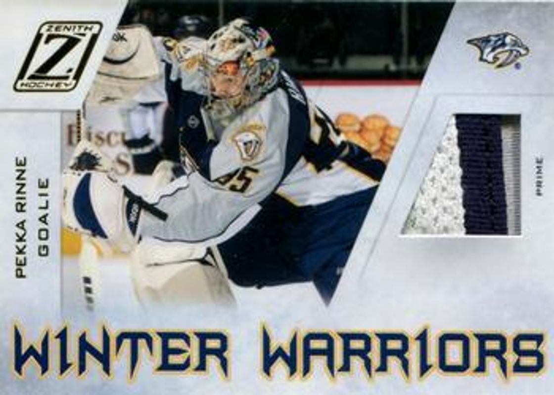 The Pekka Rinne 2010 Zenith #PR Winter Warriors Materials Prime /50 card is 1 of 7 Pekka Rinne's card variations in the 2010 Zenith set being tracked by Sports Card Investor, including Base /999, Red Hot, White Hot /25, Chasing the Cup, and Winter Warriors Materials.