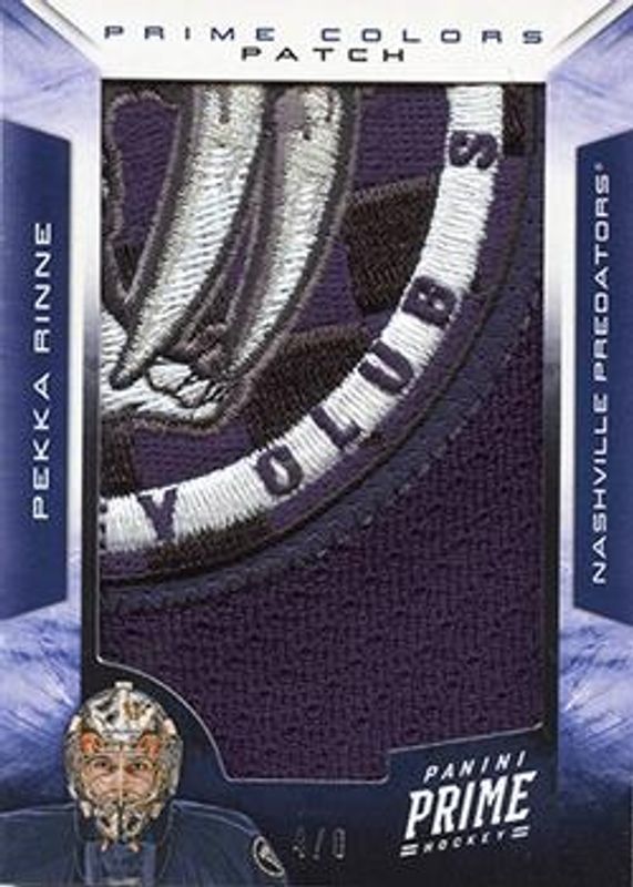 The Pekka Rinne 2012 Prime #39 Colors Patch /4 card is 1 of 22 Pekka Rinne's card variations in the 2012 Prime set being tracked by Sports Card Investor, including Base /249, HoloSilver /50, HoloGold /25, Black /3, and 2011 Prime Signatures /99.