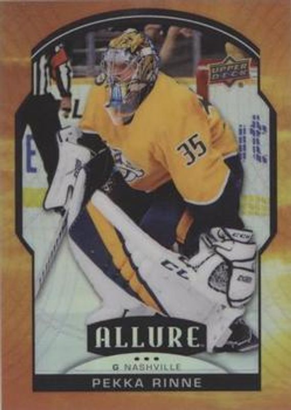 The Pekka Rinne 2020 Upper Deck Allure #4 Sunset card is 1 of 38 Pekka Rinne's card variations in the 2020 Upper Deck Allure set being tracked by Sports Card Investor, including Base, 2005 Shield, Black Rainbow, Blue China, and Leopard.