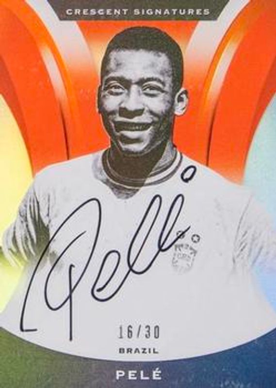 The Pele 2017 Nobility #CS-P Crescent Signatures Orange /49 card is 1 of 38 Pele's card variations in the 2017 Nobility set being tracked by Sports Card Investor, including #3 Base, #91 Base, #91 Red /199, #3 Red /199, and #91 Blue /99.