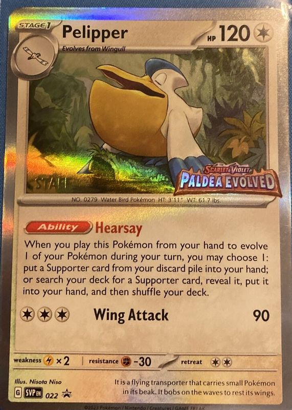 The Pelipper 2023 Scarlet & Violet: Black Star Promo #SVP022 Prerelease Staff Promo (Staff) card in Raw TCG (Near Mint) condition has not changed in price in the last 30 days and was last sold for $39.58 .