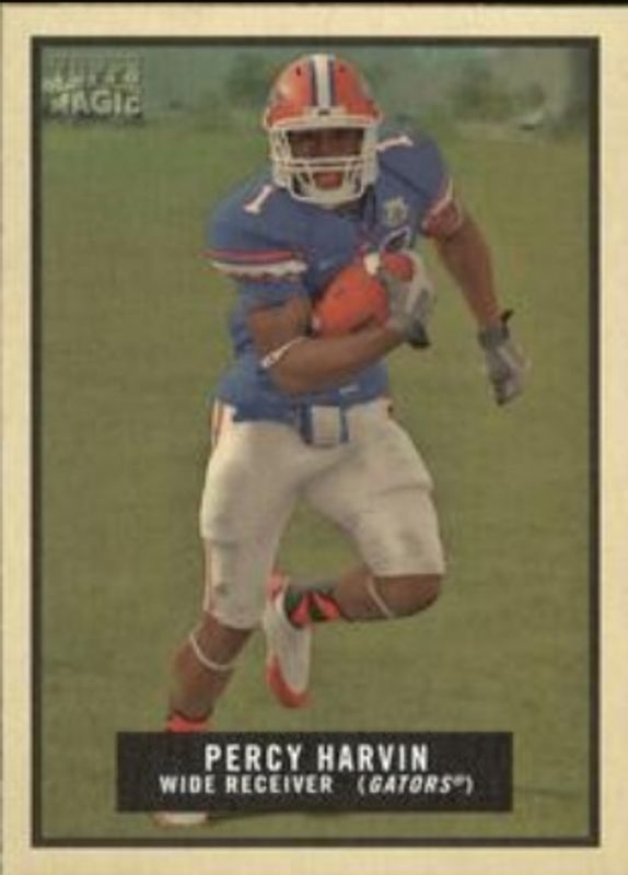 The Percy Harvin 2009 Topps Magic #57 Mini Rookie card is 1 of 6 Percy Harvin's card variations in the 2009 Topps Magic set being tracked by Sports Card Investor, including Base, Mini Black, 1948 Magic, Autographs, and Thrills.