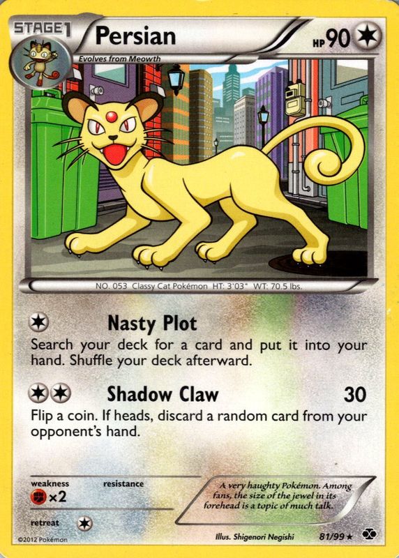 The Persian 2012 Black & White: Next Destinies #81/99 Base card in Raw TCG (Lightly Played) condition has not changed in price in the last 30 days and was last sold for $1.25 .