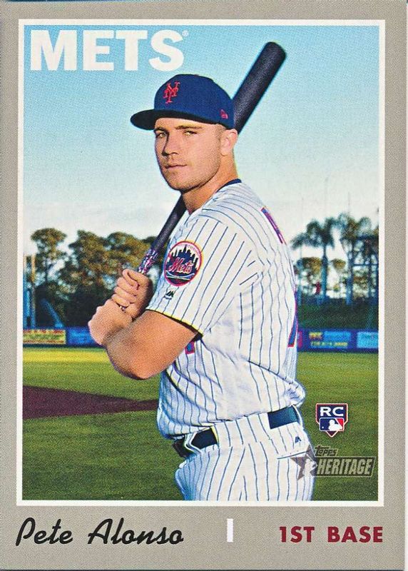 This card is 1 of 8 Pete Alonso's card variations in the 2019 Topps Heritage set being tracked by Sports Card Investor, including Base, Photo Variation (Action), Purple Hot Box Refractor, Variation (Nickname), and Chrome /999.