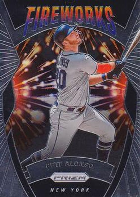 The Pete Alonso 2020 Prizm #F-2 Fireworks card is 1 of 84 Pete Alonso's card variations in the 2020 Prizm set being tracked by Sports Card Investor, including Base, Blue, Carolina Blue, Cosmic Haze, and Green.