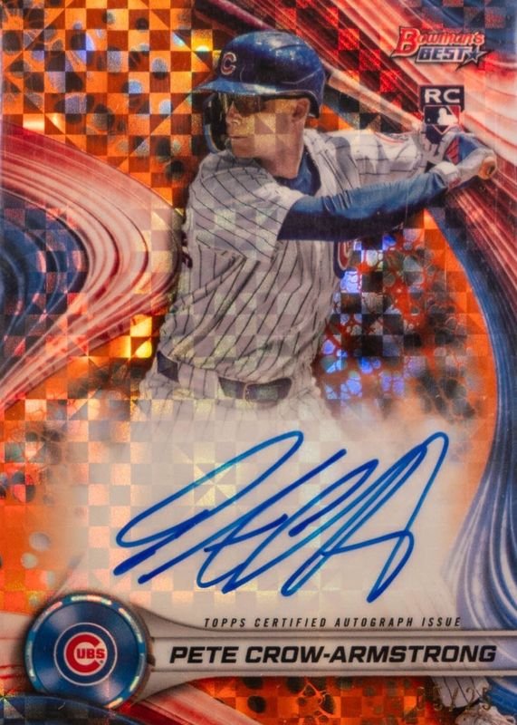 The Pete Crow-Armstrong 2024 Bowman's Best #B24-PC Best of 2024 Autographs - Orange X-Fractor /25 Rookie card in Raw condition has not changed in price in the last 30 days and was last sold for $223.50 .