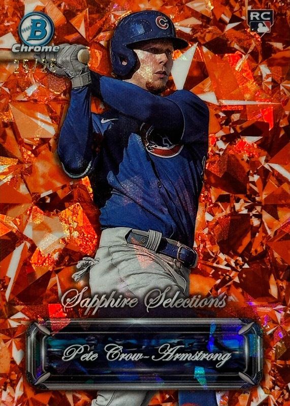 The Pete Crow-Armstrong 2024 Bowman Sapphire Edition #BSS-15 Sapphire Selections - Orange /25 Rookie card in Raw condition has not changed in price in the last 30 days and was last sold for $80.00 .