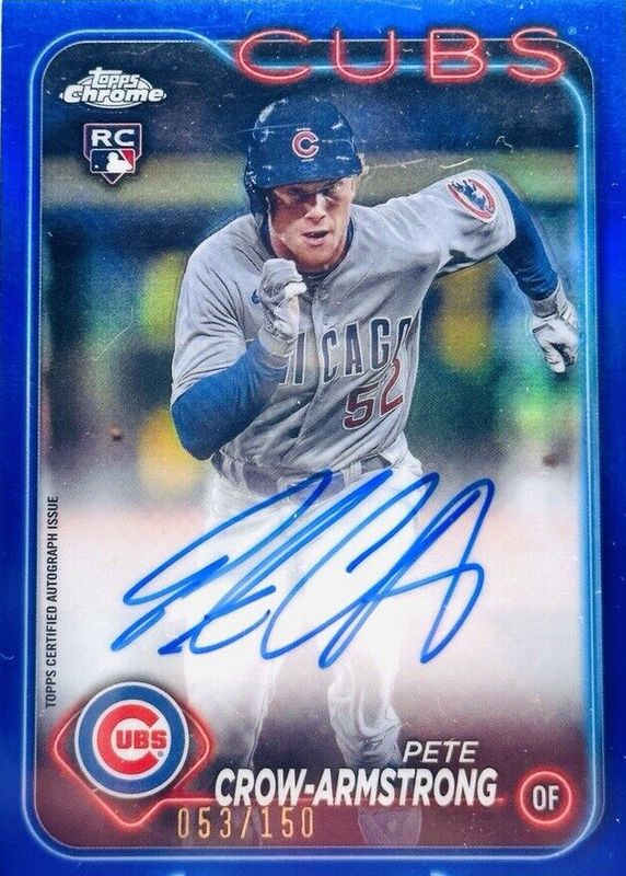 The Pete Crow-Armstrong 2024 Topps Chrome #RA-PC Rookie Autographs - Blue Refractor /150 card in Raw condition has not changed in price in the last 30 days and was last sold for $355.00 .