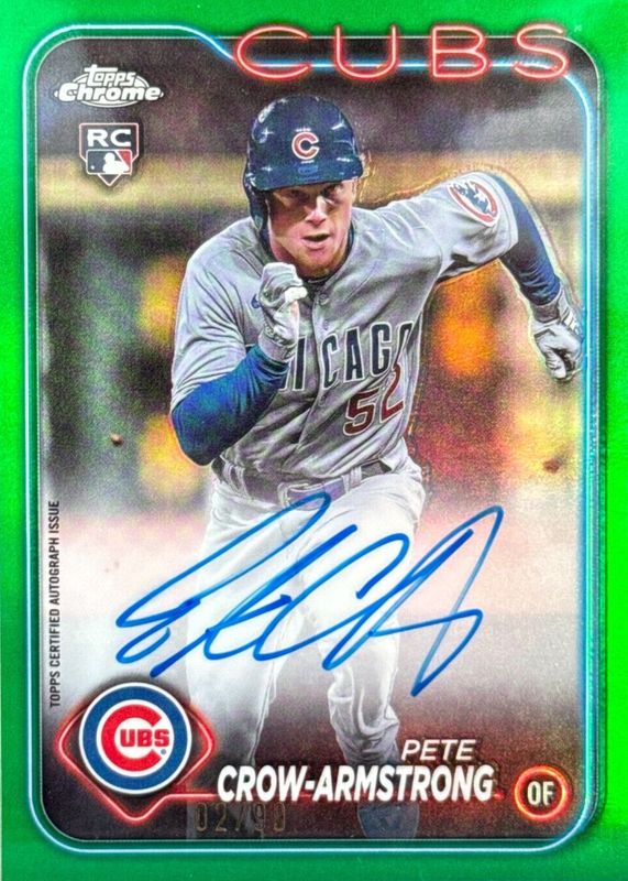 The Pete Crow-Armstrong 2024 Topps Chrome #RA-PC Rookie Autographs - Green Refractor /99 card in Raw condition has not changed in price in the last 30 days and was last sold for $150.00 .