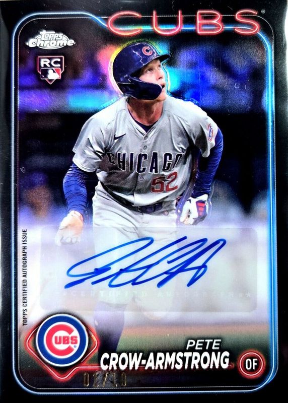 The Pete Crow-Armstrong 2024 Topps Chrome Update #AC-PC Autographs - Black Refractor /10 Rookie card in Raw condition has not changed in price in the last 30 days and was last sold for $521.34 .