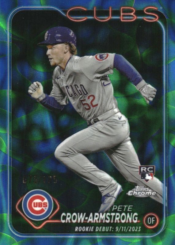 The Pete Crow-Armstrong 2024 Topps Chrome Update #USC158 Rookie Debut - Blue & Green Lava Lamp Refractor /125 card in Raw condition has moved down -$3.99 (-8.0%) in the last 30 days and was last sold for $46.00 .