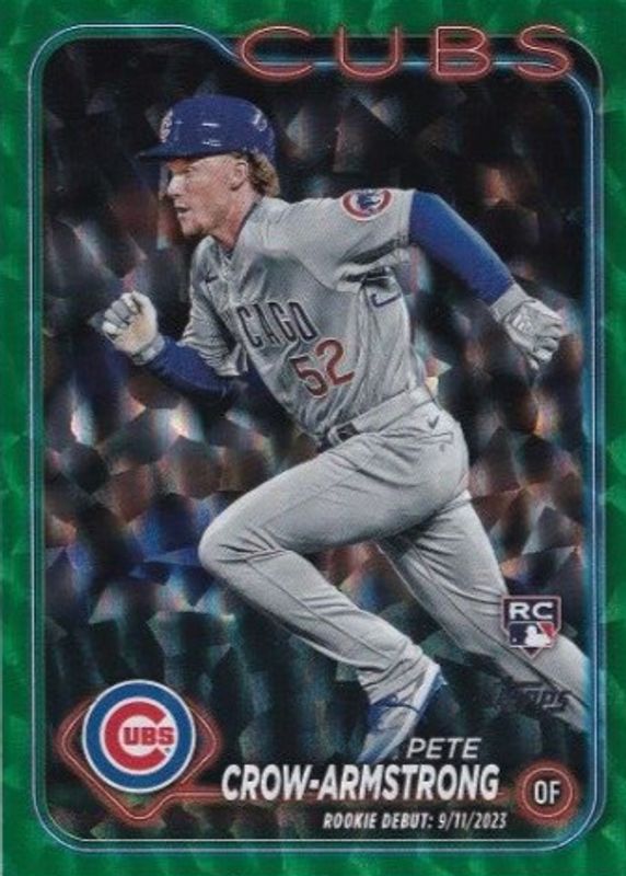The Pete Crow-Armstrong 2024 Topps Update #US91 Rookie Debut - Green Crackle Foilboard /499 card in Raw condition has not changed in price in the last 30 days and was last sold for $10.79 .