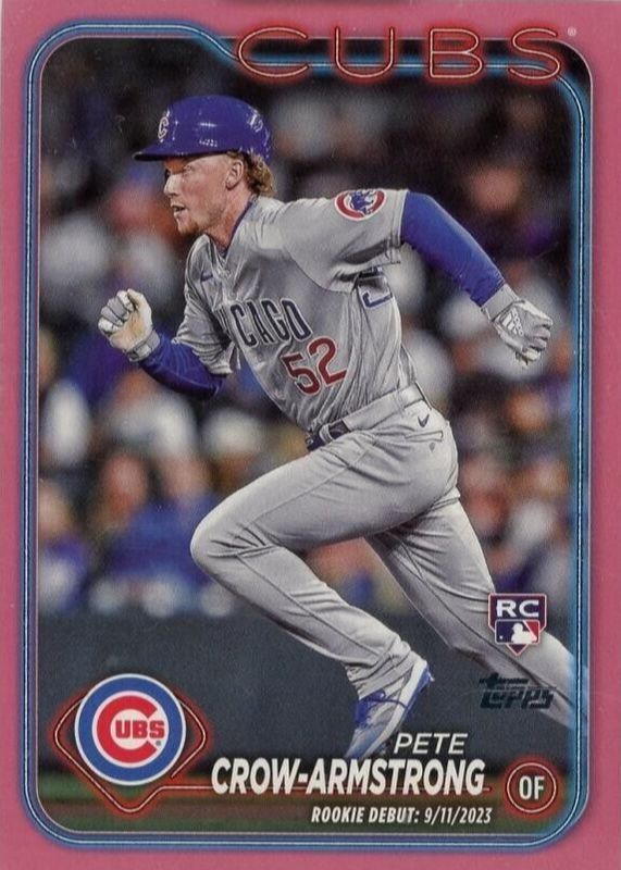 The Pete Crow-Armstrong 2024 Topps Update #US91 Rookie Debut - Mother's Day Hot Pink /50 card in Raw condition has not changed in price in the last 30 days and was last sold for $59.00 .