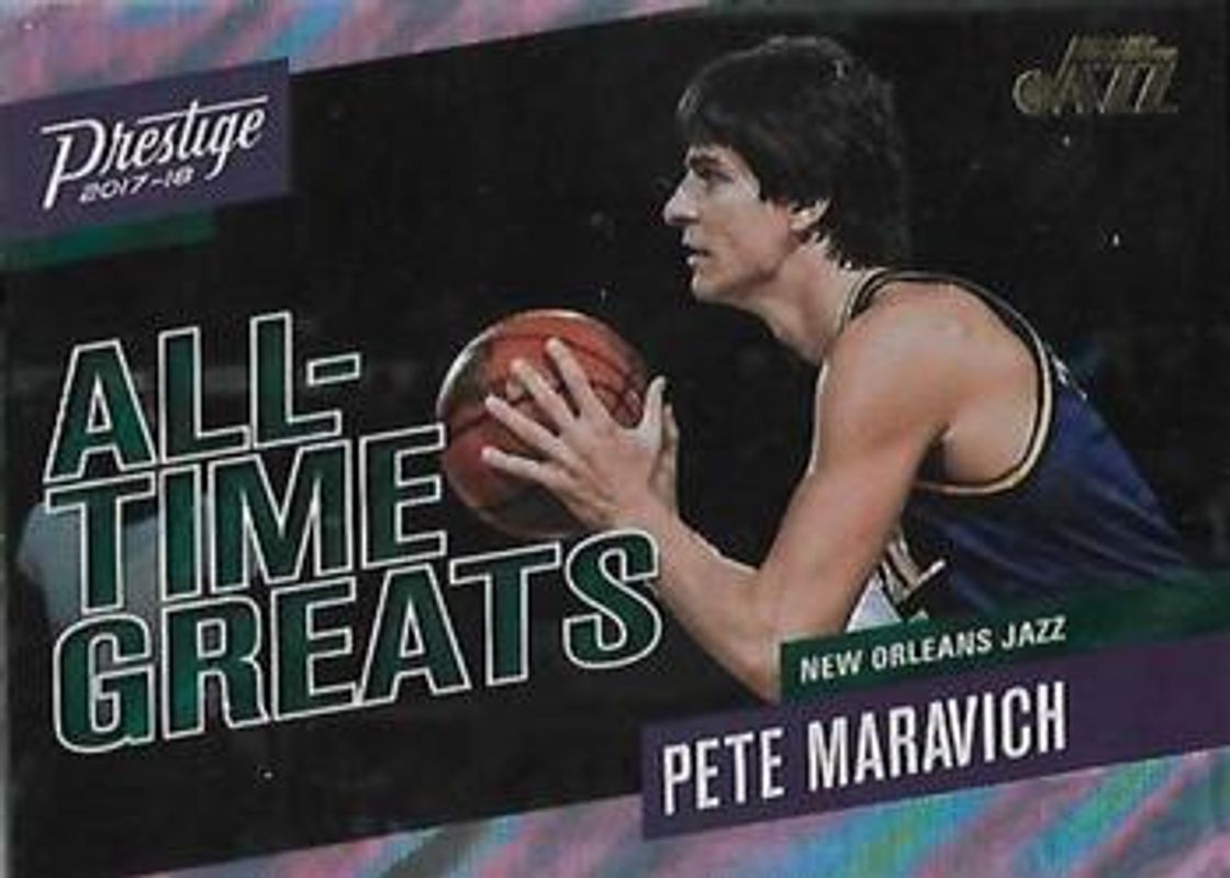 The Pete Maravich 2017 Prestige #5 All Time Greats - Mist card is 1 of 7 Pete Maravich's card variations in the 2017 Prestige set being tracked by Sports Card Investor, including All Time Greats, All Time Greats - Crystal, All Time Greats - Horizon, All Time Greats - Rain, and All Time Greats - Crystal Gold /10.