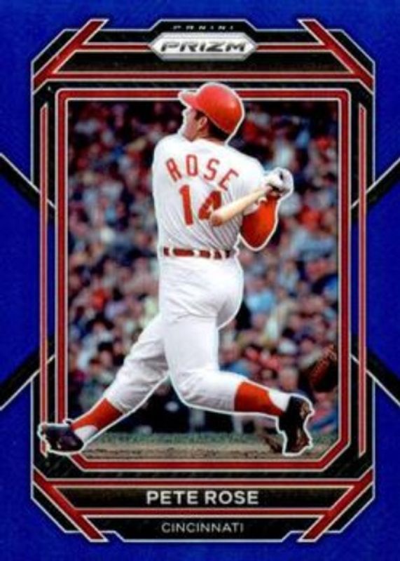 The Pete Rose 2023 Prizm #33 Blue /149 card is 1 of 49 Pete Rose's card variations in the 2023 Prizm set being tracked by Sports Card Investor, including Base, Blue Ice, Giraffe, Green Ice, and Hyper.