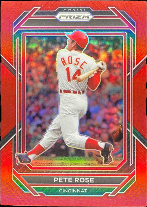The Pete Rose 2023 Prizm #33 Red /199 card is 1 of 49 Pete Rose's card variations in the 2023 Prizm set being tracked by Sports Card Investor, including Base, Blue Ice, Giraffe, Green Ice, and Hyper.