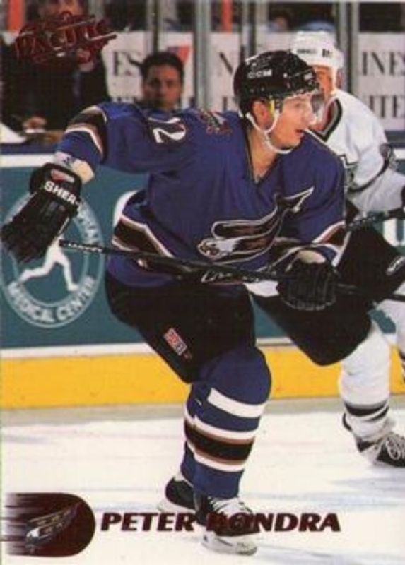 The Peter Bondra 1998 Pacific #12 Red card is 1 of 6 Peter Bondra's card variations in the 1998 Pacific set being tracked by Sports Card Investor, including Base, Ice Blue, Dynagon Ice, Gold Crown Die Cuts, and Titanium Ice /99.