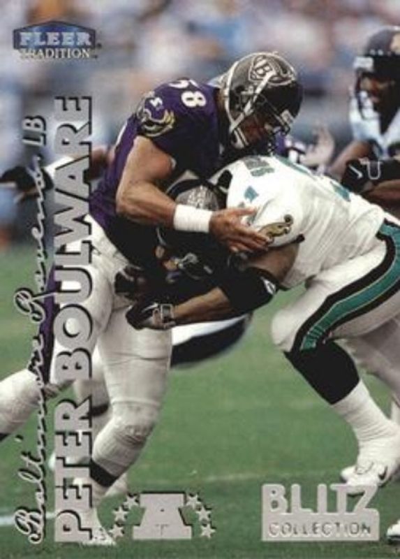The Peter Boulware 1999 Fleer Tradition #11BC Blitz Collection card is 1 of 3 Peter Boulware's card variations in the 1999 Fleer Tradition set being tracked by Sports Card Investor, including Base, and Trophy Collection /20.