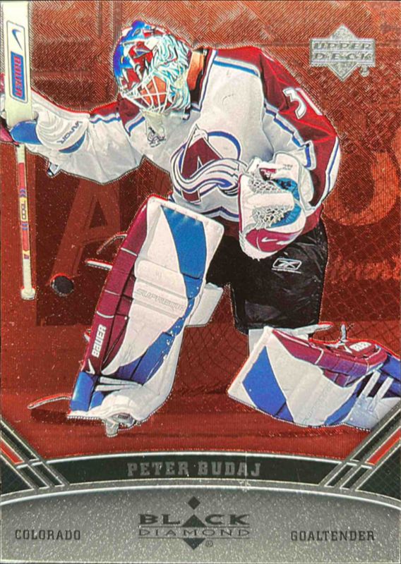 The Peter Budaj 2006 Upper Deck Black Diamond #21 Ruby /100 card is 1 of 8 Peter Budaj's card variations in the 2006 Upper Deck Black Diamond set being tracked by Sports Card Investor, including Base, Gold /10, Black /1, Jerseys, and Jerseys Ruby /100.