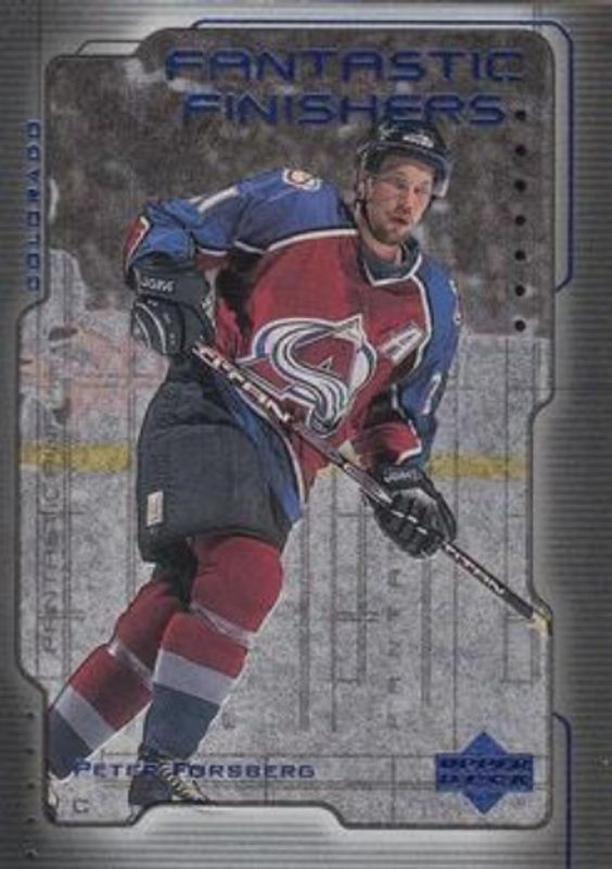 The Peter Forsberg 1999 Upper Deck #FF10 Fantastic Finishers card is 1 of 32 Peter Forsberg's card variations in the 1999 Upper Deck set being tracked by Sports Card Investor, including #154 Base, #39 Base, #154 UD Exclusives /100, #39 UD Exclusives /100, and #154 UD Exclusives 1/1 /1.