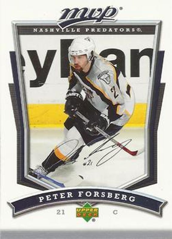 The Peter Forsberg 2007 Upper Deck MVP #210 Base card is 1 of 4 Peter Forsberg's card variations in the 2007 Upper Deck MVP set being tracked by Sports Card Investor, including Gold Scripts /100, Super Scripts /25, and Game Faces.