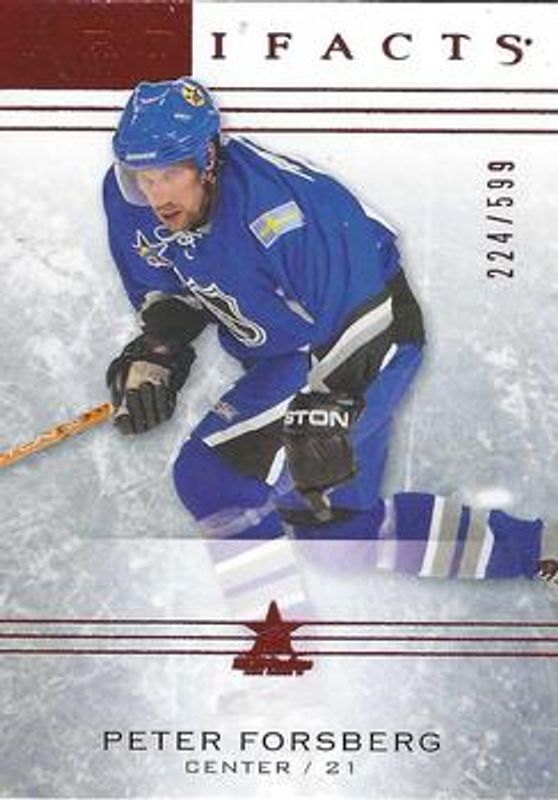 The Peter Forsberg 2014 Upper Deck Artifacts #5 Ruby /499 card is 1 of 18 Peter Forsberg's card variations in the 2014 Upper Deck Artifacts set being tracked by Sports Card Investor, including Base /999, Emerald /99, Sapphire /85, Gold Spectrum /25, and Black /5.