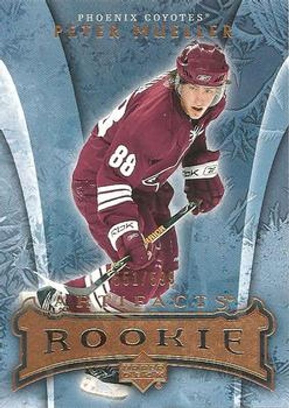 The Peter Mueller 2007 Upper Deck Artifacts #208 Base /599 Rookie card is 1 of 6 Peter Mueller's card variations in the 2007 Upper Deck Artifacts set being tracked by Sports Card Investor, including Silver /100, Gold /50, Blue /25, Bronze /10, and Silver Rainbow /1.