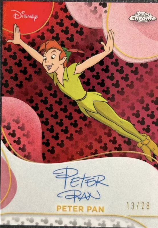 The Peter Pan 2025 Topps Chrome Disney #FA-9 Facsimile Autographs - Mickey Mouse Logo Refractor /28 card is 1 of 79 Peter Pan's card variations in the 2025 Topps Chrome Disney set being tracked by Sports Card Investor, including #155 Base, #157 Base, #157 Mini Diamonds Refractor, #155 Mini Diamonds Refractor, and #157 Prism Refractor.