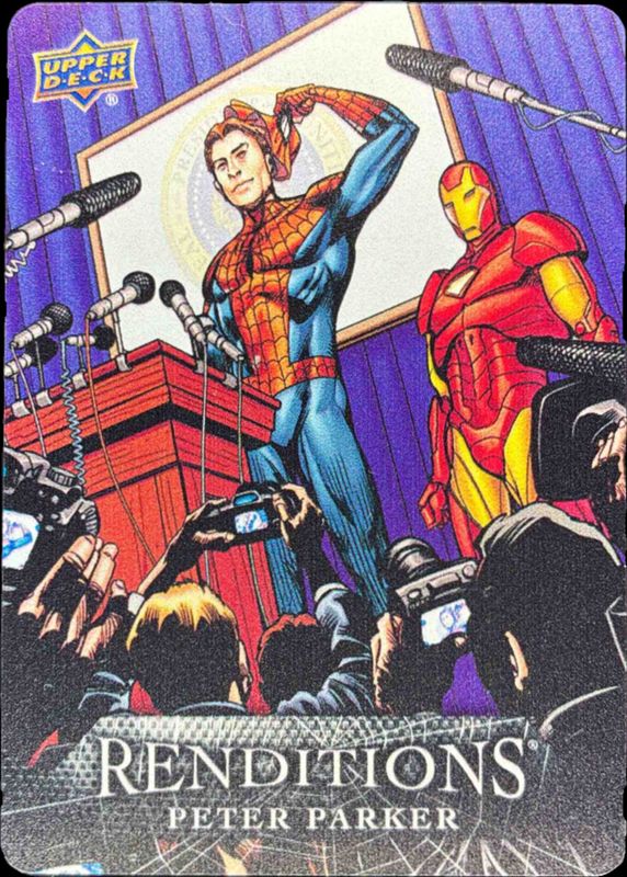 The Peter Parker 2024 Upper Deck Marvel Spider-Man Renditions #36 Metal /25 card is 1 of 32 Peter Parker's card variations in the 2024 Upper Deck Marvel Spider-Man Renditions set being tracked by Sports Card Investor, including #39 Canvas Cover Variant, #36 Canvas Cover Variant, #36 Legendary Responsibility Gaming Variant, #39 Legendary Responsibility Gaming Variant, and #39 Goblin Green /399.