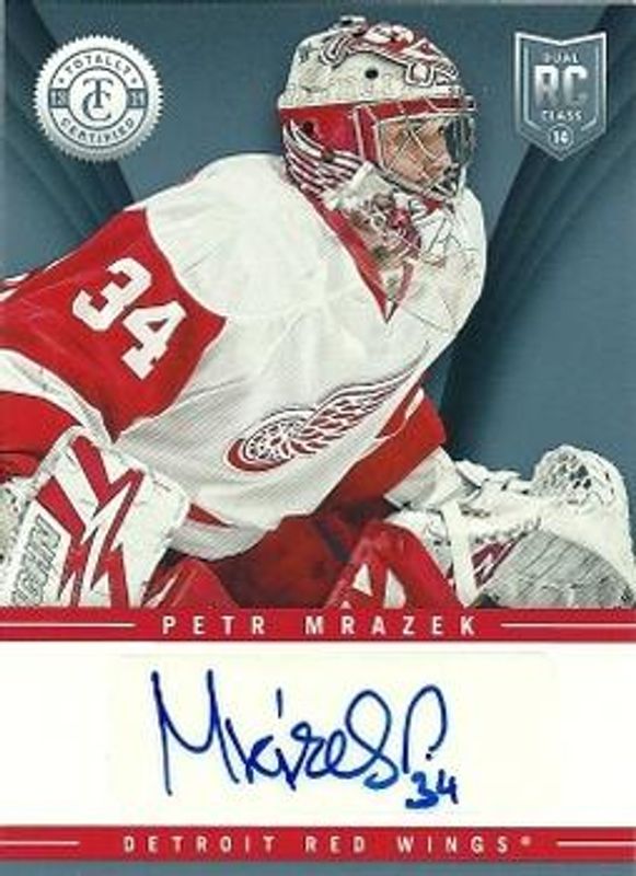 The Petr Mrazek 2013 Totally Certified #TR-PMR Rookie Signatures card is 1 of 33 Petr Mrazek's card variations in the 2013 Totally Certified set being tracked by Sports Card Investor, including Base, Platinum Red /100, Platinum Blue /50, Mirror Platinum Purple /35, and Mirror Platinum Red /25.