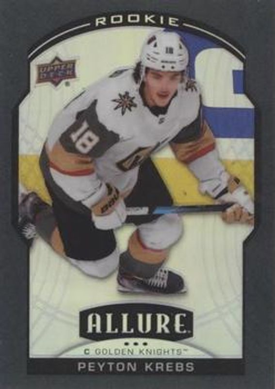 The Peyton Krebs 2020 Upper Deck Allure #96 Black Rainbow Rookie card is 1 of 57 Peyton Krebs' card variations in the 2020 Upper Deck Allure set being tracked by Sports Card Investor, including #96 Base, #142 Base, #96 2005 Shield, #96 Blue China, and #142 Double Rainbow.