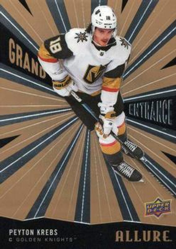 The Peyton Krebs 2020 Upper Deck Allure #GE-21 Grand Entrance Rookie card is 1 of 57 Peyton Krebs' card variations in the 2020 Upper Deck Allure set being tracked by Sports Card Investor, including #96 Base, #142 Base, #96 2005 Shield, #96 Black Rainbow, and #96 Blue China.