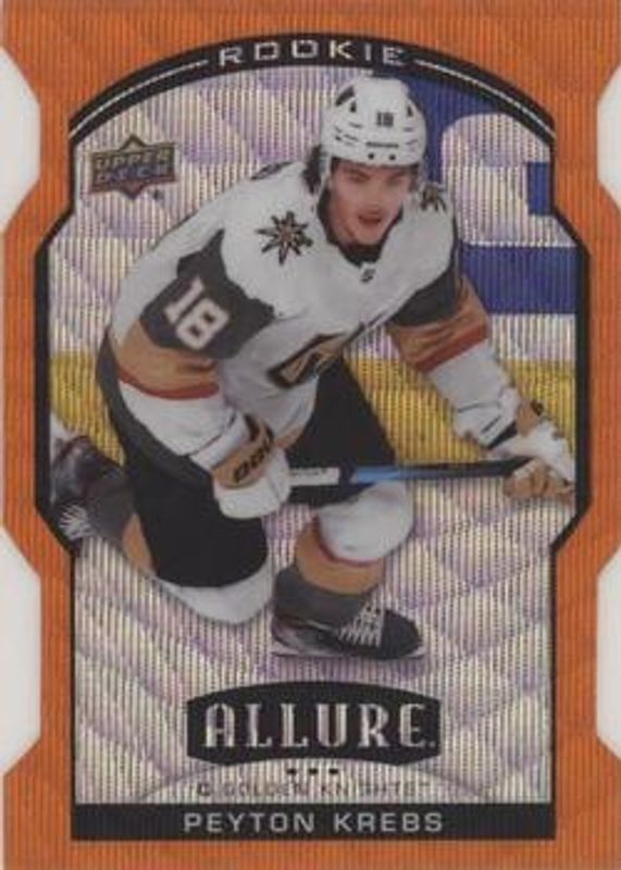 The Peyton Krebs 2020 Upper Deck Allure #96 Orange Slice Rookie card is 1 of 57 Peyton Krebs' card variations in the 2020 Upper Deck Allure set being tracked by Sports Card Investor, including #96 Base, #142 Base, #96 2005 Shield, #96 Black Rainbow, and #96 Blue China.