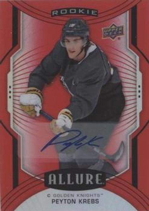The Peyton Krebs 2020 Upper Deck Allure #142 Red Rainbow Autographs /299 Rookie card is 1 of 57 Peyton Krebs' card variations in the 2020 Upper Deck Allure set being tracked by Sports Card Investor, including #96 Base, #142 Base, #96 2005 Shield, #96 Black Rainbow, and #96 Blue China.