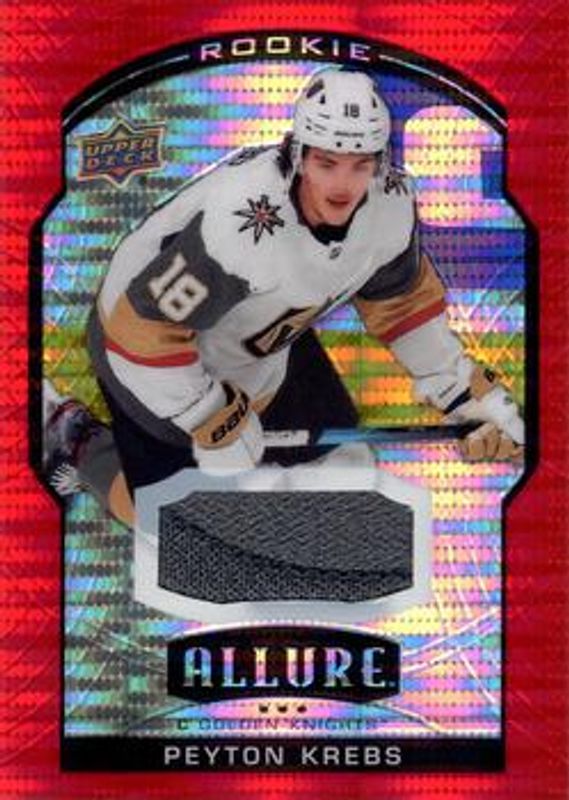 The Peyton Krebs 2020 Upper Deck Allure #96 Red Rainbow Jersey Rookie card is 1 of 57 Peyton Krebs' card variations in the 2020 Upper Deck Allure set being tracked by Sports Card Investor, including #96 Base, #142 Base, #96 2005 Shield, #96 Black Rainbow, and #96 Blue China.