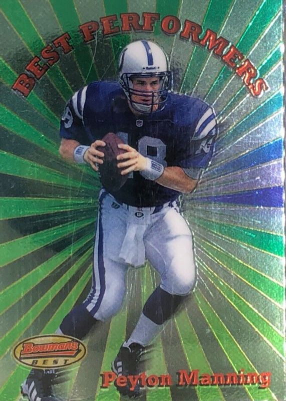 The Peyton Manning 1998 Bowman's Best #BP1 Best Performers Rookie card in Raw condition has moved down -$5.07 (-45.8%) in the last 30 days and was last sold for $6.00 .