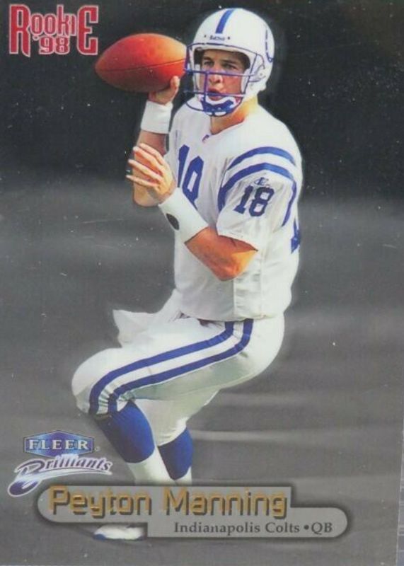 The Peyton Manning 1998 Fleer Brilliants #120 Base Rookie card in Raw condition has moved down -$6.51 (-29.6%) in the last 30 days and was last sold for $15.49 .