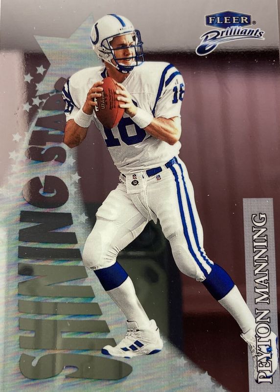 The Peyton Manning 1998 Fleer Brilliants #9 Shining Stars Rookie card in Raw condition has moved up $1.99 (+24.9%) in the last 30 days and was last sold for $9.99 .