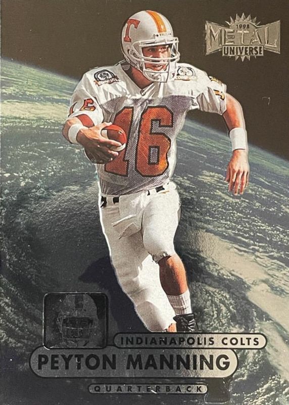 The Peyton Manning 1998 Metal Universe #189 Base Rookie card in Raw condition has moved down -$2.28 (-31.3%) in the last 30 days and was last sold for $5.00 .