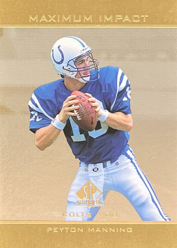 The Peyton Manning 1998 SP Authentic #SE11 Maximum Impact Rookie card in Raw condition has moved up $0.01 (+0.2%) in the last 30 days and was last sold for $5.00 .