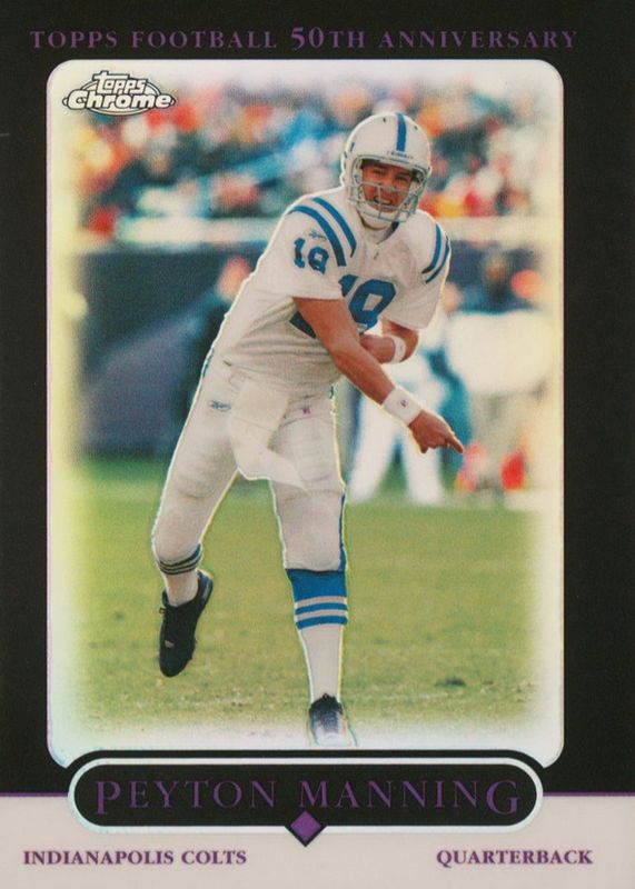 This card is 1 of 9 Peyton Manning's card variations in the 2005 Topps Chrome set being tracked by Sports Card Investor, including Golden Moments - Refractor, League Leaders - Refractor, Refractor, Golden Moments - Gold X-Fractor /399, and Gold X-Fractor /399.