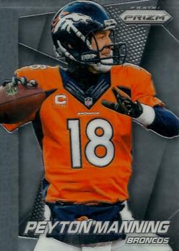 The Peyton Manning 2014 Prizm #58 Base card is 1 of 27 Peyton Manning's card variations in the 2014 Prizm set being tracked by Sports Card Investor, including Blue, Camo, Green, Neon Green & Yellow, and Orange.