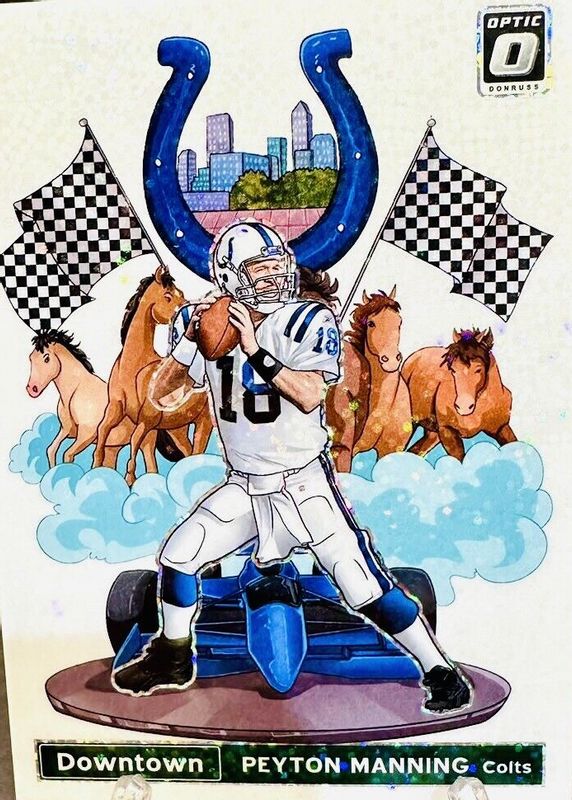 This card is 1 of 5 Peyton Manning's card variations in the 2021 Optic set being tracked by Sports Card Investor, including Downtown /(SSP), Downtown - Black Pandora /25, Downtown - Gold /10, and Downtown - Gold Vinyl /1.
