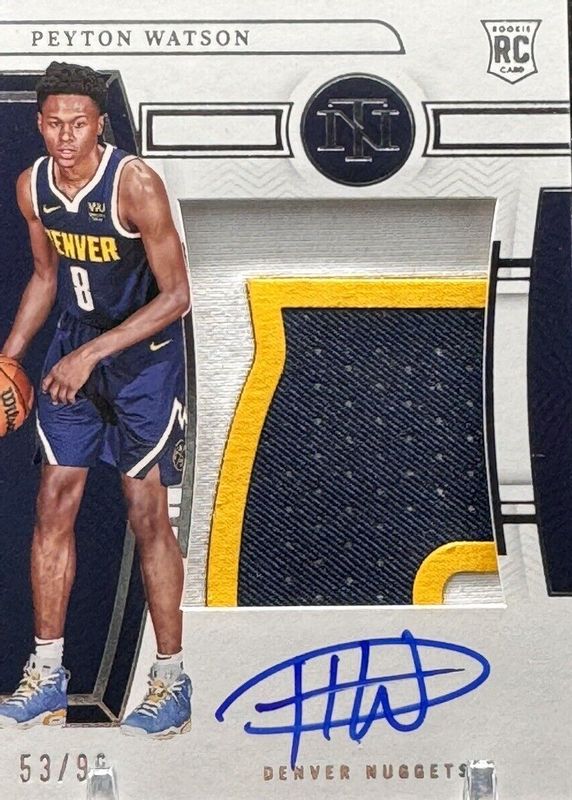 This card is 1 of 10 Peyton Watson's card variations in the 2022 National Treasures set being tracked by Sports Card Investor, including Rookie Patch Auto - Red /75, Rookie Patch Auto - Bronze /49, Rookie Patch Auto - Pink /25, Rookie Patch Auto - Gold FOTL /24, and Rookie Patch Auto - Gold /10.