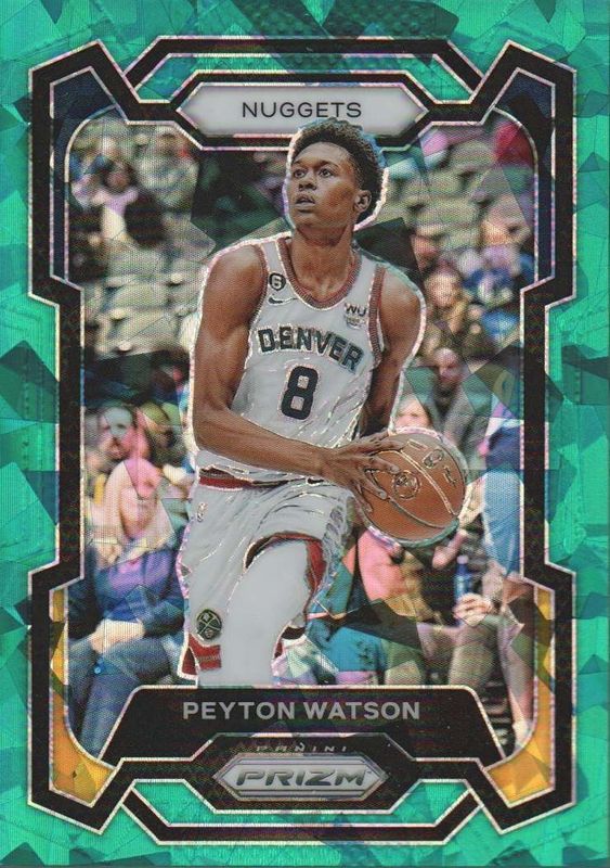 The Peyton Watson 2023 Prizm #247 Teal Ice /225 card is 1 of 70 Peyton Watson's card variations in the 2023 Prizm set being tracked by Sports Card Investor, including Base, Blue Wave, Choice Blue Yellow Green, Fast Break, and Green.