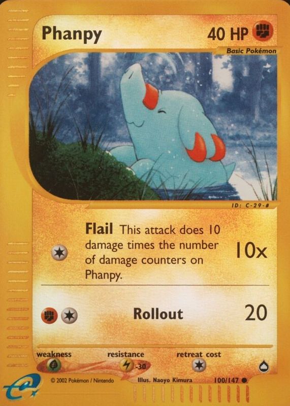 The Phanpy 2003 Aquapolis #100/147 Reverse Holo card in Raw TCG (Near Mint) condition has not changed in price in the last 30 days and was last sold for $25.05 .