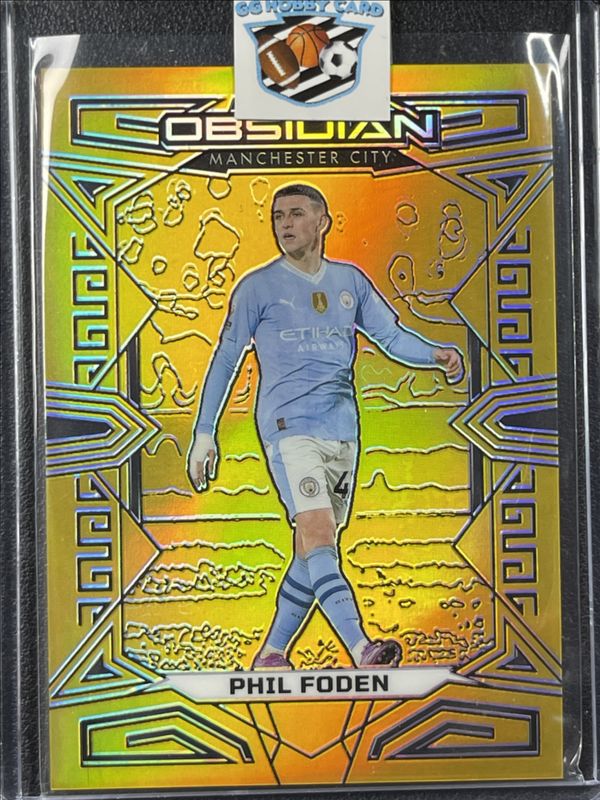 The Phil Foden 2023 Obsidian #84 Electric Etch Gold Flood /10 card is 1 of 34 Phil Foden's card variations in the 2023 Obsidian set being tracked by Sports Card Investor, including #151 Base /120, #84 Base /120, #151 Electric Etch Red Pulsar /49, #84 Electric Etch Red Pulsar /49, and #84 Electric Etch Orange /40.