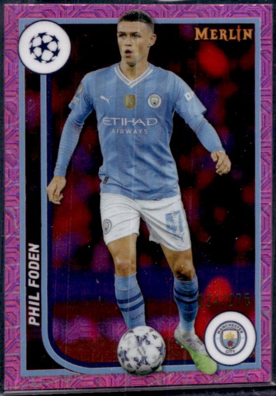 The Phil Foden 2023 Topps Merlin Chrome UEFA Club Competitions #74 Pink Mojo Refractor /275 card is 1 of 38 Phil Foden's card variations in the 2023 Topps Merlin Chrome UEFA Club Competitions set being tracked by Sports Card Investor, including Base, Aqua Prism Refractor, Refractor, Vintage Merlin Refractor, and Neon Green Shimmer Refractor /399.